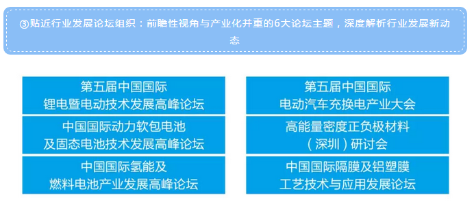 展會同期舉辦:2019 第五屆中國國際鋰電暨電動技術發展高峰論壇、中國國際動力軟包電池及固態電池技術發展高峰論壇、高能量密度正負極材料(深圳)研討會、深圳電動出行展、深圳氫能暨燃料電池展、深圳充電樁技術設備展、2019 中國鋰電池行業年度品牌評選活動。