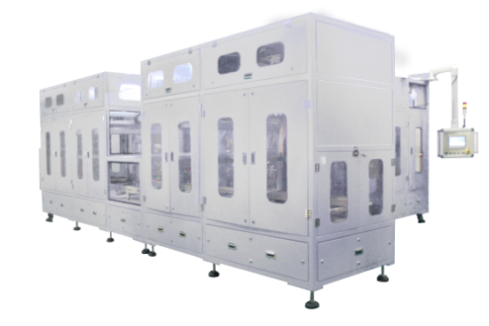 本設備適用于軟包裝電池全自動封裝,其功能包含:鋁塑膜放卷→除塵→縱切→沖殼→裁切→殼體入轉盤→對折→切頂邊;裸電芯自動上料→CCD檢測及分選→整形定位→入殼體→頂封(含極耳糾正)→側封→角位封→絕緣測試→切側邊→噴碼→掃碼及NG分選→包膜→半成品下料等功能。