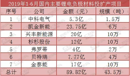 動力電池應用分會研究部統計數據顯示,2019年6月我國新能源汽車動力電池裝機量約6.61GWh,同比增長130.82%。2019年1-6月,實現裝機量30.01GWh,同比增長94.29%。動力電池裝機量的大幅增長帶動負極材料市場需求旺盛,進入2019年以來國內不少負極材料廠家紛紛擴建產能。