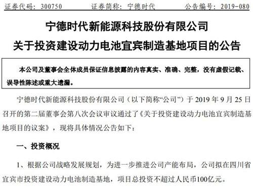 100億元!寧德時代動力電池制造基地落戶四川宜賓