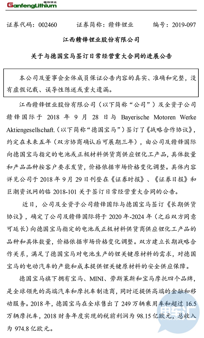 贛鋒鋰業與寶馬簽訂42億元鋰供應合約
