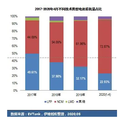 目前,三元鋰電池一騎絕塵,研究機構EVTank最新的數據顯示,今年1~4月,國內三元鋰電池(NCM,正極材料為鎳鈷錳三種材料)裝機量占比升至72.87%,而磷酸鐵鋰電池(LFP)的裝機量進一步跌至22.93%,錳酸鋰電池(LMO)以及其他電池加起來占的比例不足5%。這與前幾年的動力電池格局明顯不同,就在2017年,磷酸鐵鋰電池與三元鋰電池的裝機量占比分別是49.61%和44.69%,但次年前者就被后者趕超,且差距逐年拉大。
